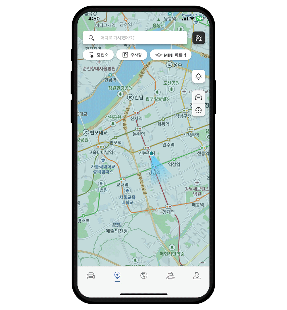 MINI 앱 홈화면에서 예약을 위해 “지도” 아이콘을 탭하여 지도로 이동합니다.