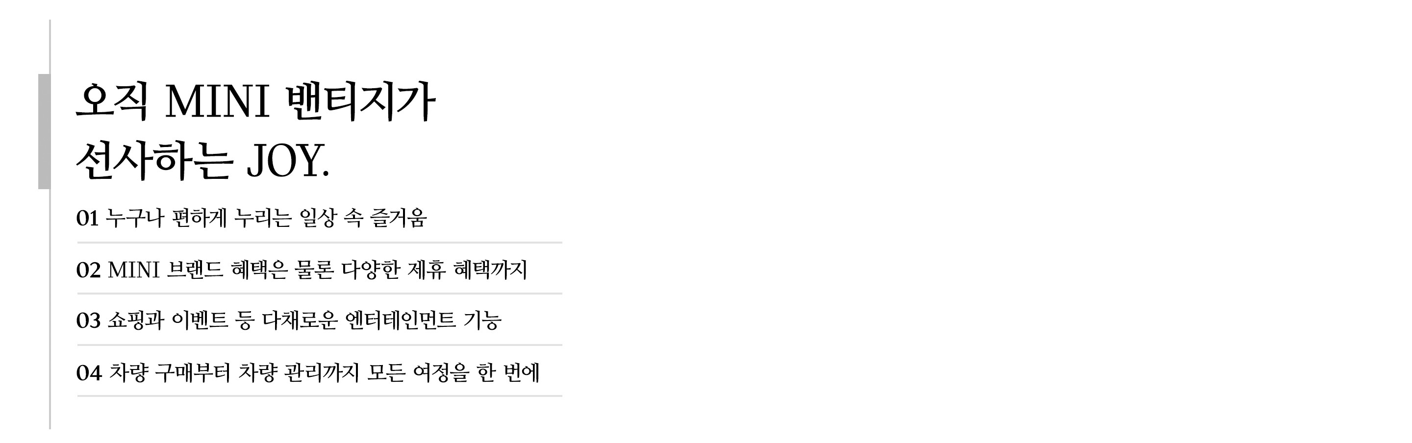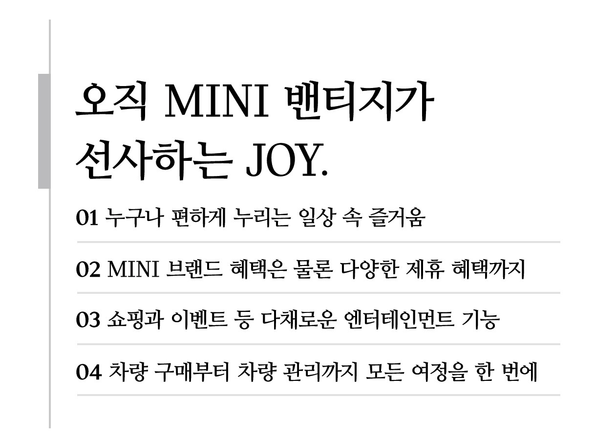 드라이빙 너머, 당신의 라이프스타일에 즐거움을 전할 MINI 최초의 멤버십 서비스 MINI 밴티지를 소개합니다. MINI 밴티지와 함께라면 누구나 ‘MINI다움‘을 일상에서 경험할 수 있습니다. 현금처럼 사용할 수 있는 MINI Coin으로 경험하는 다양한 제휴사 혜택뿐만 아니라 MINI의 최신 소식, 고객 전용 라이프스타일 쇼핑몰 Joy Mall 그리고 프리미엄 이벤트 초청까지, 더욱 즐거운 MINI 라이프를 시작해 보세요.