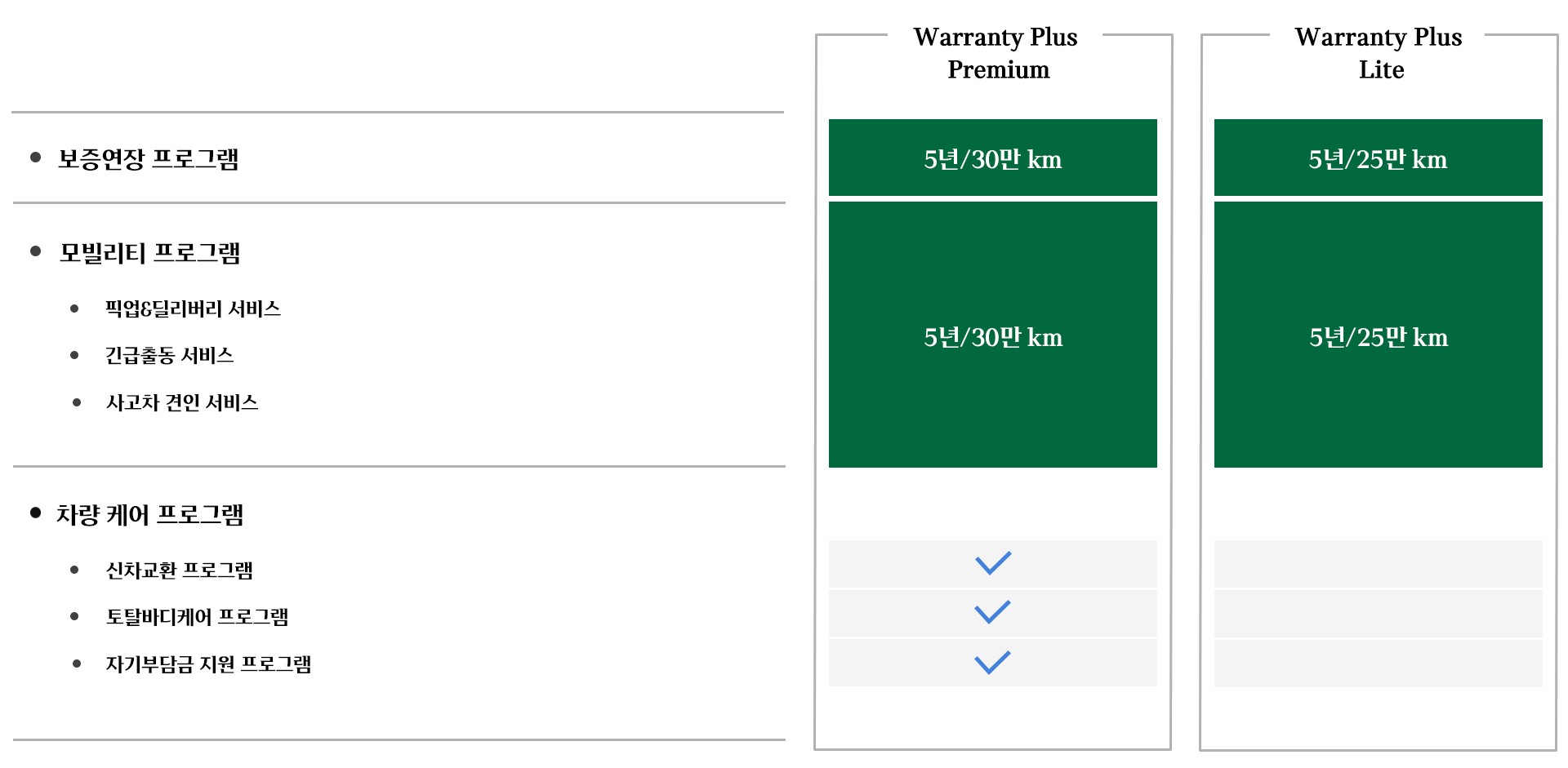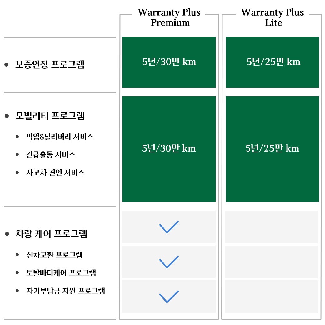 ※ Warranty Plus Lite에서 제공하는 보증 연장, 모빌리티 프로그램의 서비스 제공 내용은 Warranty Plus Premium와 동일하나 보장하는 마일리지가 상이합니다.